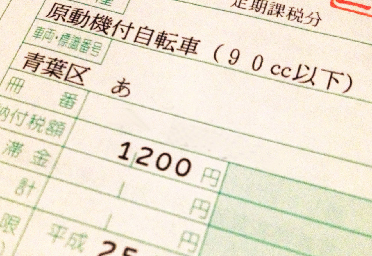 この画像は、見ての通り原付自転車の90cc以下に課せられている軽自動車税、1200円也。