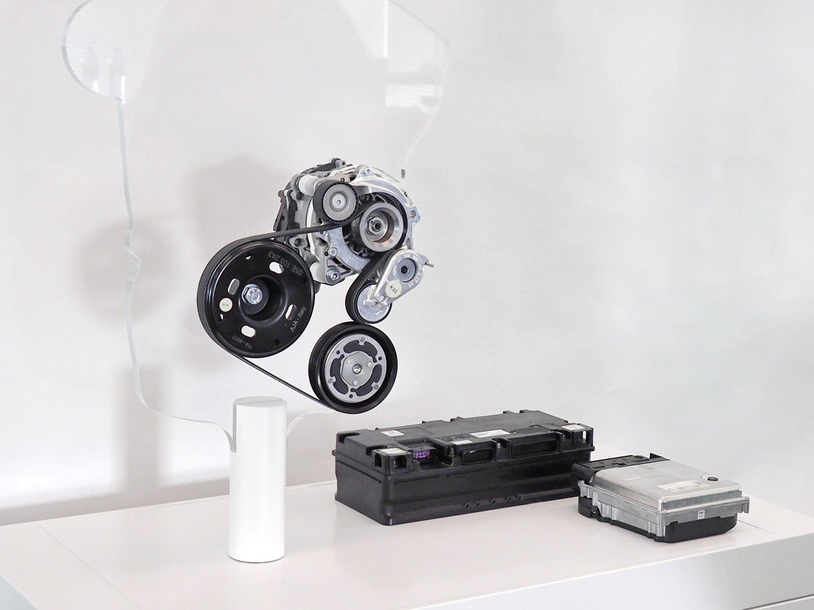 このディスプレイが車載状態を再現しているとすると、クランクプーリーの近くにテンショナー付きのISG(スタータージェネレーター)を置くといったレイアウト。リリースでは明記されていないのですが、エアコンのコンプレッサーも状況によってはISGによって動かすことも視野に入れていることを示す展示というのは考えすぎでしょうか……。