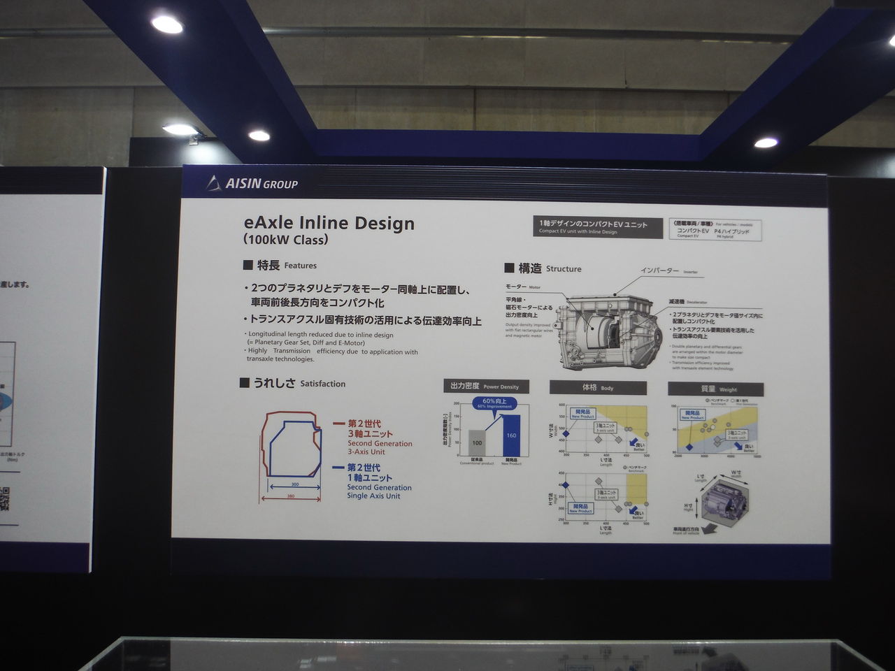 デンソーとアイシンが展示していた部品から受ける印象でいえば、デンソーがコントロール系と適合を担当、アイシンはeAxle(トランスアクスル・モーター・インバーターのパッケージ)の設計と適合を担当、そしてブルーネクサス社が販売窓口といったイメージでありましょうか。ただし、eAxleだけを見ると、ここはアイシン、ここはデンソーが得意だろうと思えるところもあるので、上記のイメージはあくまでも大筋での製造担当のイメージであって、実際には両社のエンジニアが絡み合って電動化に必要なパーツを設計していくであろうと思えるわけですが。