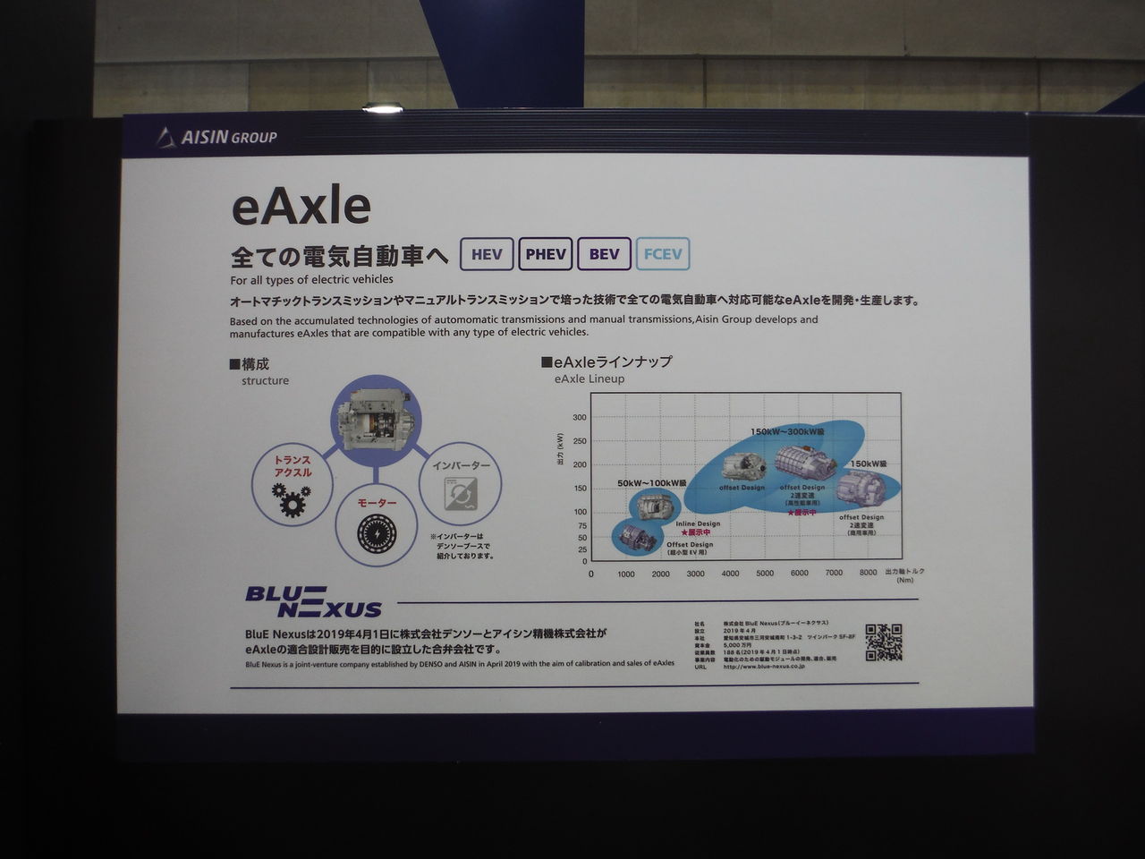 そのデンソーとアイシンは電動化に向けて「eAxle」推しの展示という印象強しでありました。そこには、2019年4月1日に、デンソーとアイシン精機で「ブルーネクサス」なる合弁会社を起こしたことも大きく影響しているはず。同社は、eAxleの適合設計販売を一手に引き受ける、まさに車両電動化におけるワンストップサービスを提供する会社といえる存在であります。