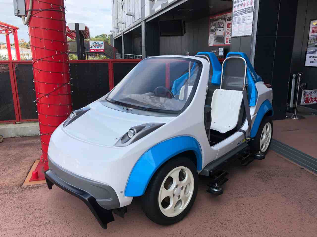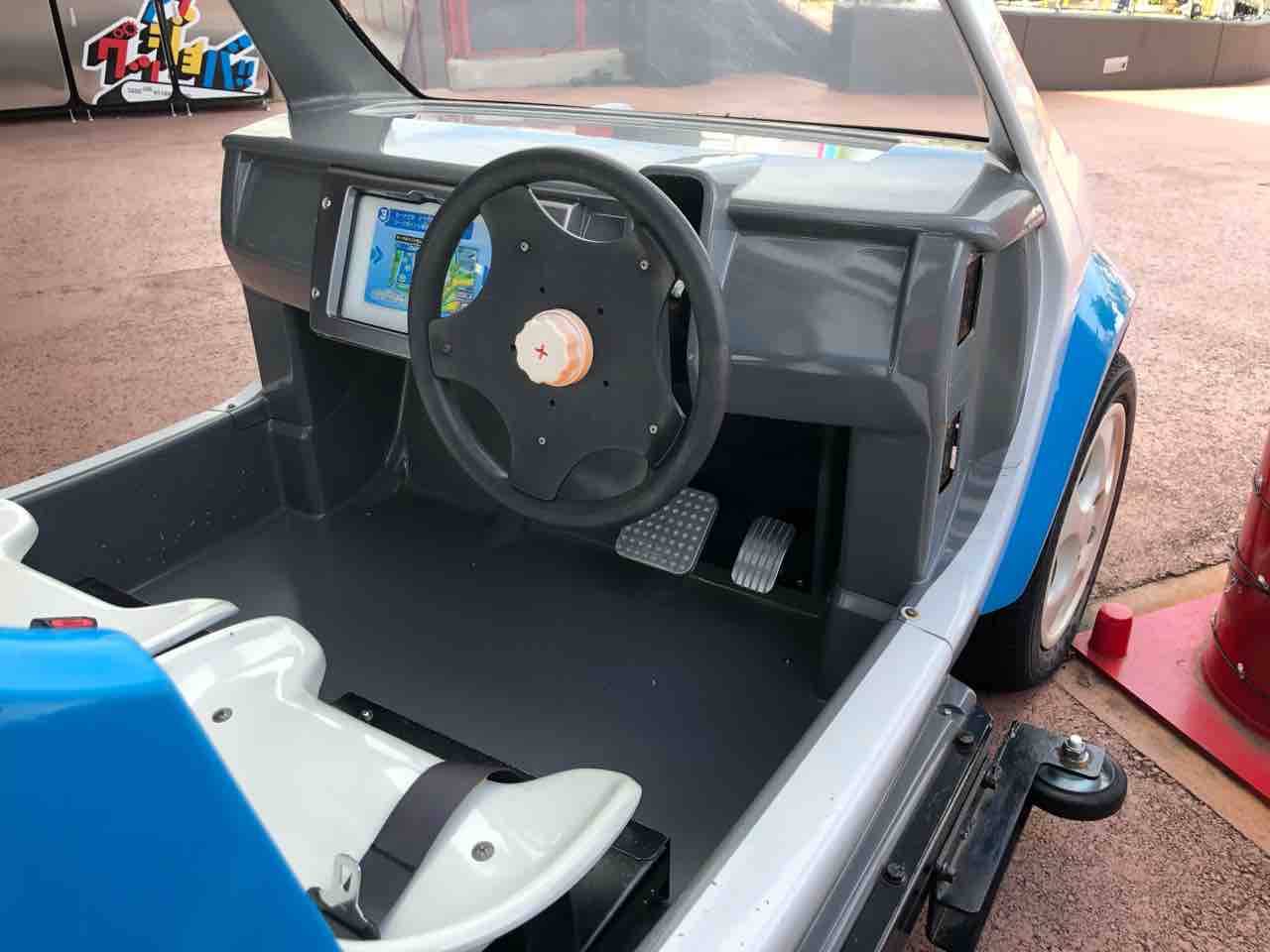 一方、コクピットはいかにも遊園地のゴーカート的。おそらくステアリングはパワーアシストのないタイプで、ブレーキもノンサーボといったところでは? とはいえフロントはディスクブレーキだったりと、どこか本格派の匂いがあるのが、自動車メーカーが協賛しているアトラクションらしいところでしょうか。