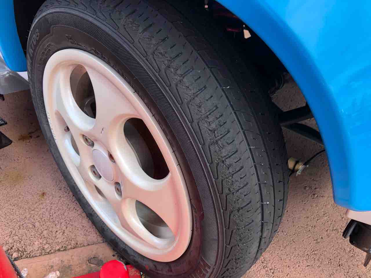 とはいえ、おそらくコースが左回りなのでしょう。右フロントにはかなりの負担がかかっている状態。左右のローテーションくらいすればいいのに、などと思ってしまうのは野暮でしょうか。ちなみに、ホイールはアルミ製、エム・エル・ジェイのPOPOROを履いておりました。ゴーカートとしては、けっこう贅沢かつ、マジな仕様といえるのでは?