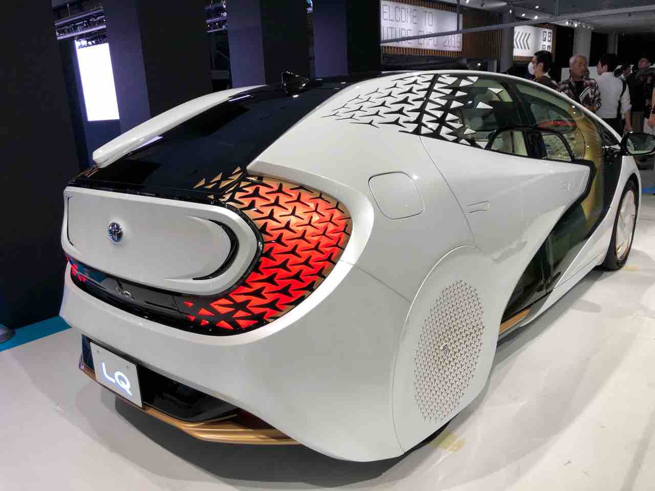 本当に公道走行可能なコンセプトカーなのか? という前提で眺めてきたのですが、たしかにワイパーを装備しておりますし、ナンバーはつけられそうな気配もあり。さらにいろいろな角度から見ていると、その骨格にプリウス系のプラットフォームを使っているような雰囲気で、張りぼてのショーカーではなく普通に走行可能なクルマという気がしてくるから不思議なもの。ちなみにLQは航続可能距離300 km程度のEVと発表されております。とはいえ、本当にこのコンセプトカーにナンバーをつけて公道を走っている姿は想像しづらいもので、実際には量産車に人工知能ユニットや路面表示機能などを搭載して体感する試乗会になるのでは? という思いもどこかにあるのですが、さて?