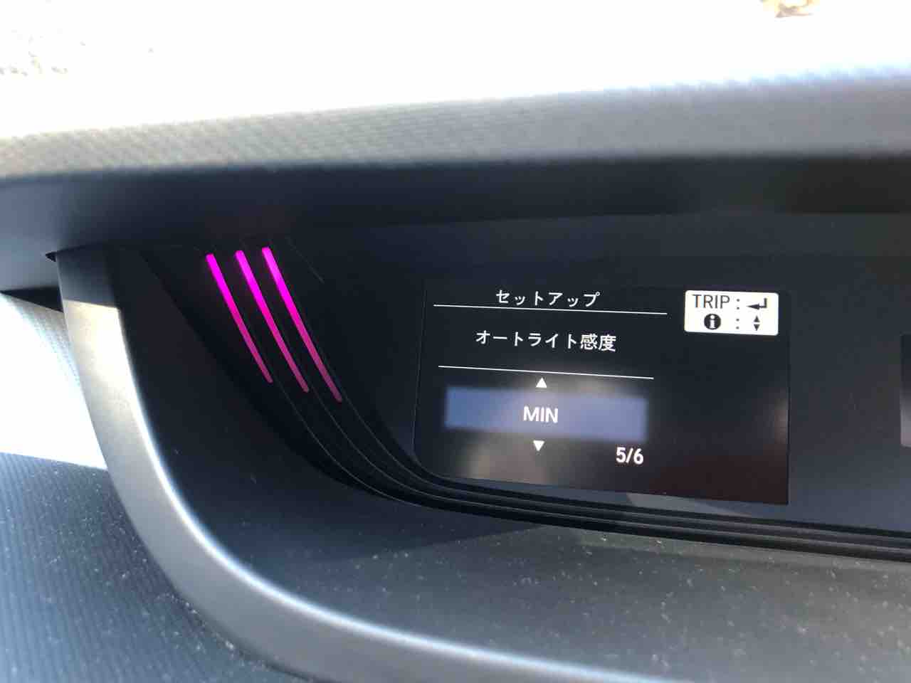 画面に映り込みがあって見えづらいのは恐縮ですが、オートライト感度の調整は、ステアリングスイッチを使ってインフォメーションディスプレイの表示を見ながら行なえるのでありました。まずは△のスイッチで、「時計/車両設定」メニューにしたら「TRIP」ボタンを押して選択。