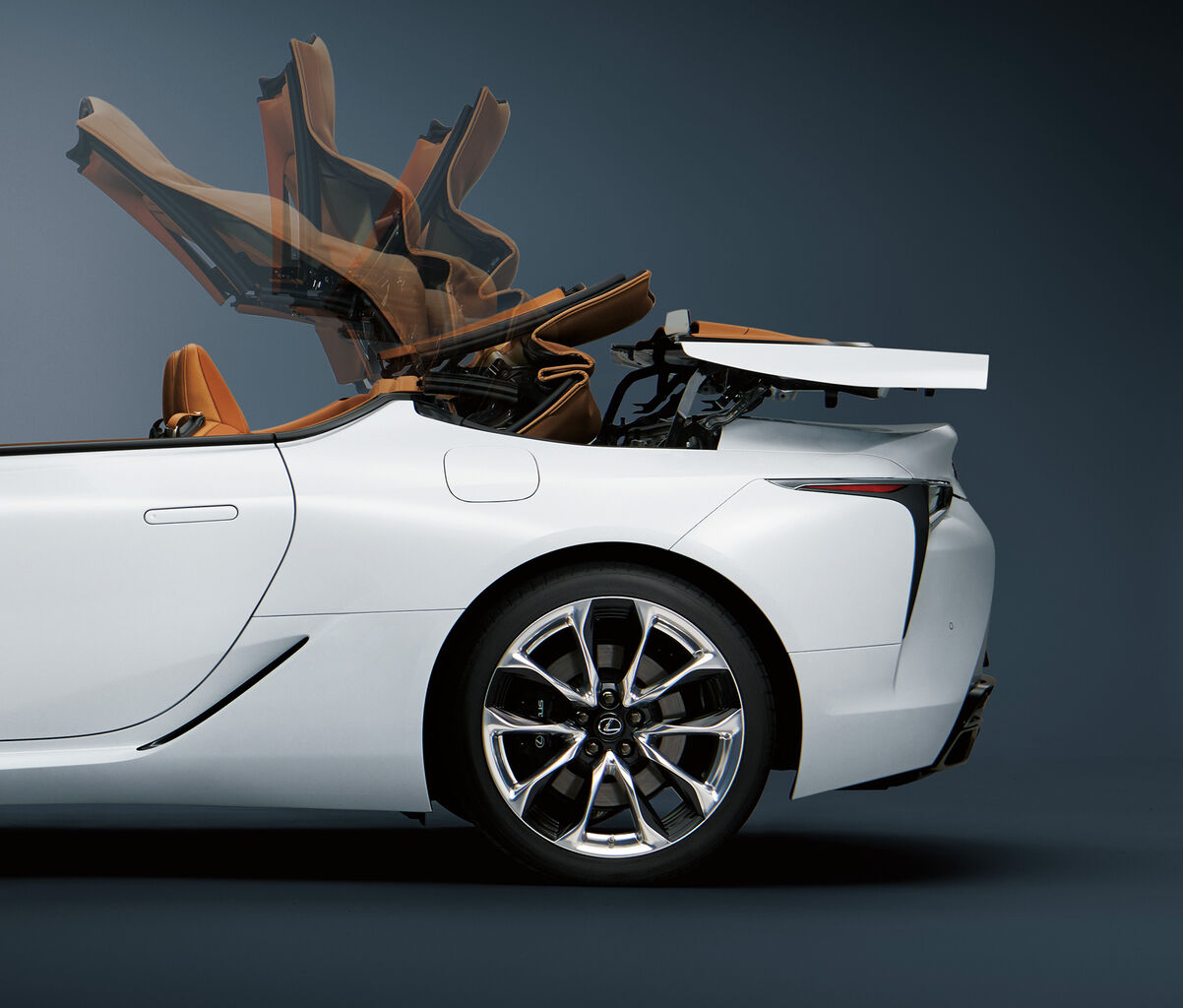 5.0L V8エンジンとDirect Shift-10ATの組み合わせで、伸び感のあるリニアな加速を追求しました。ドライバーがどのような環境下で走行しているのかを判定し、走行シーンに応じて駆動力をきめ細かく制御。日常のスムーズな加速から限界域の車両コントロールまで、ドライバーの感覚に合う走りを提供します。自然吸気V8エンジンの官能的なサウンドをLC500 Convertibleでも楽しんでいただくため、吸気音をキャビン内に共鳴させるサウンドジェネレーターや、より迫力のある排気音を演出する外装バルブをクーペと同様に採用。ルーフオープン時のより気持ち良いサウンドを作りこみました。
