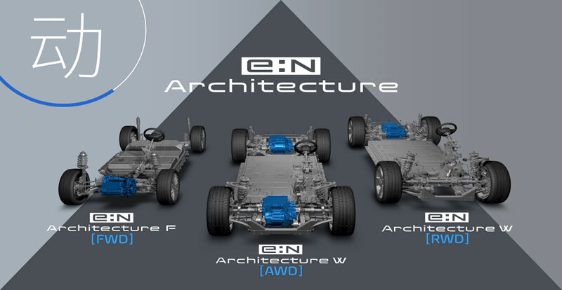 なかでも気になるのは「e:Nアーキテクチャ」で、中国での発表リリースを見るとひとつのプラットフォームでFWD・AWD・RWDと作り分ける前提となっているのでした。