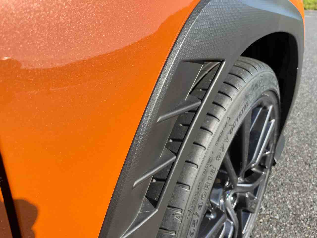 エクステリアの特徴である樹脂パーツについては、別にSUV的なテイストを狙ったわけではなく、完全なる機能部品。樹脂の表面に空気の剥離を抑制するヘキサゴンパターンを入れることで直進安定性の向上を狙っているというのが、その役割。ようは樹脂表面のシボによって空力性能を稼ぐというアプローチであって、そうなると表面を塗装してしまうというのは機能的にはNGで、このようにむき出しになるのは必然というわけ。はたして、この樹脂パーツを機能美として認識させることができるかどうかも気になるところでありますが、さて?