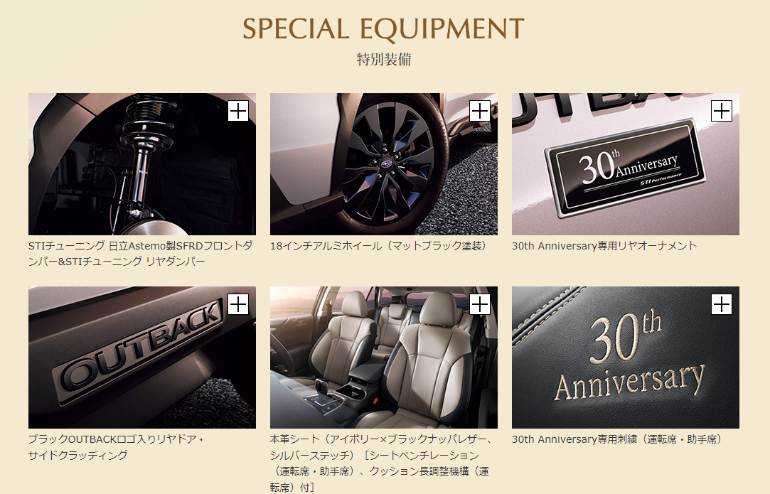 ■ エクステリア・ フロントグリル(ブラック塗装+ラスターブラック塗装)・ フロントバンパーガード(ブラック塗装)&フロントフォグランプカバー(ブラック塗装加飾付)・ ルーフレール(クロスバービルトインタイプ、ブラック塗装)・ リヤバンパーガード(ブラック塗装)・ ドアミラー(ブラック塗装)・ ブラックOUTBACKロゴ入りリヤドア・サイドクラッディング・ OUTBACK/シンメトリカルAWDリヤオーナメント(ラスターブラック塗装)・ ルーフスポイラー(ブラック塗装)・ 30th Anniversary専用リヤオーナメント■ インテリア・ 30th Anniversary専用刺繍(運転席・助手席)・ ハーマンカードンサウンドシステム*5[専用11スピーカー(フロント6+リヤ4+サブウーファー)]・ 本革シート(アイボリー×ブラックナッパレザー、シルバーステッチ)[シートベンチレーション(運転席・助手席)、クッション長調整機構(運転席)付]・ インパネトリム(アッパー/ロア)アイボリー表皮巻(シルバーステッチ)/ブラック表皮巻(シルバーステッチ)・ ドアトリム ブラック表皮巻(シルバーステッチ)■ 足回り・メカニズム・ 18インチアルミホイール(マットブラック塗装)・ STIチューニング日立Astemo製SFRDフロントダンパー&STIチューニングリヤダンパー