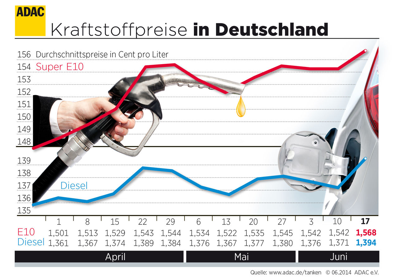 こちら、ドイツADACが発表した国内燃料価格の推移グラフ。5月に一瞬下がっておりますが、全体としてはガソリン(E10)も軽油(ディーゼル)も上昇基調。